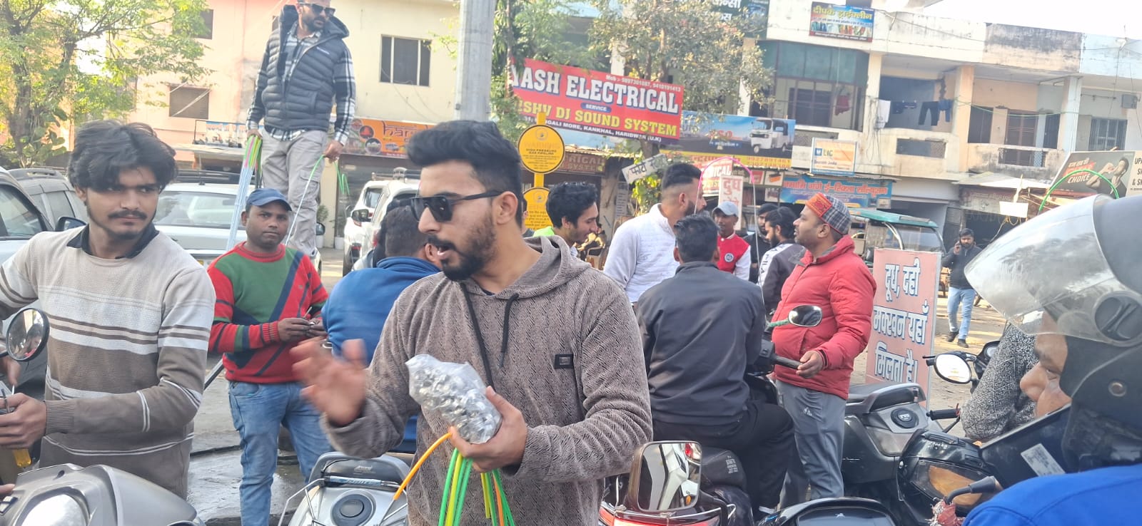 चाईनीज मांझे के खतरे से बचाव के लिए दोपहिया वाहनों पर निःशुल्क सुरक्षा तार लगा रहे युवा